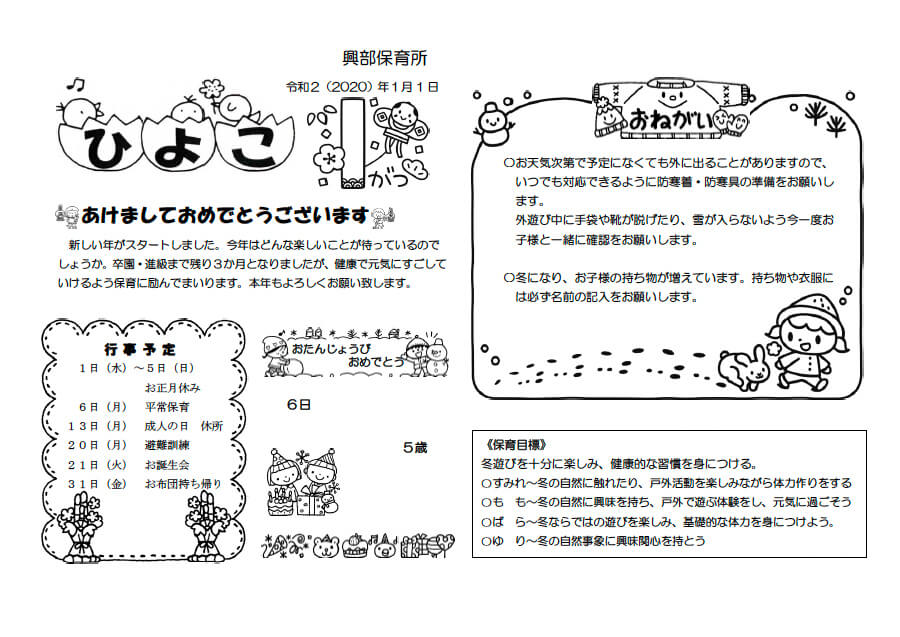 新しい年がスタートしました。今年はどんな楽しいことが待っているのでしょうか。卒園・進級まで残り3か月となりましたが、健康で元気にすごしていけるよう保育に励んでまいります。本年もよろしくお願い致します。