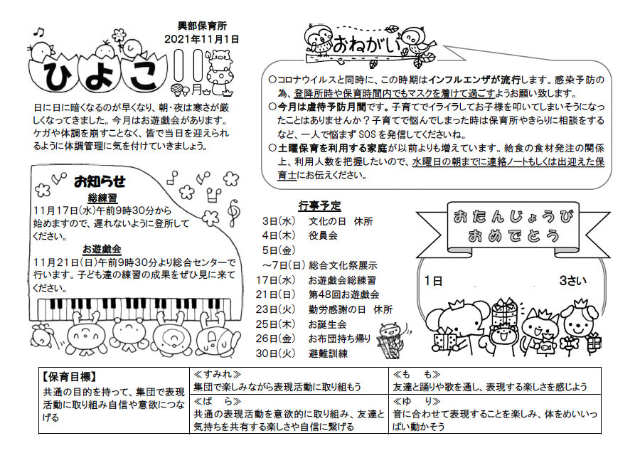 日に日に暗くなるのが早くなり、朝・夜は寒さが厳しくなってきました。今月はお遊戯会があります。ケガや体調を崩すことなく、皆で当日を迎えられるように体調管理に気を付けていきましょう。