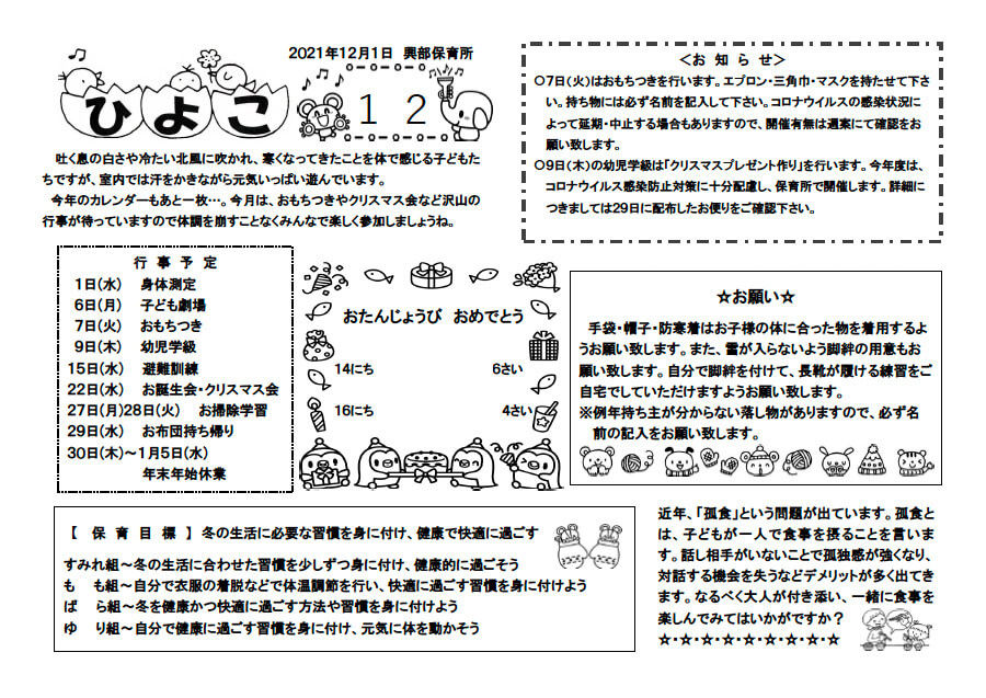吐く息の白さや冷たい北風に吹かれ、寒くなってきたことを体で感じる子どもたちですが、室内では汗をかきながら元気いっぱい遊んでいます。今年のカレンダーもあと一枚…。今月は、おもちつきやクリスマス会など沢山の行事が待っていますので体調を崩すことなくみんなで楽しく参加しましょうね。