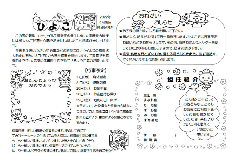 今後も手洗いうがいや消毒などの新型コロナウイルスの感染拡大防止に努め、18日(月)から通常保育を開始します。ご家庭でも感染防止を行い、元気に保育所生活を過ごせるようご協力お願いします。