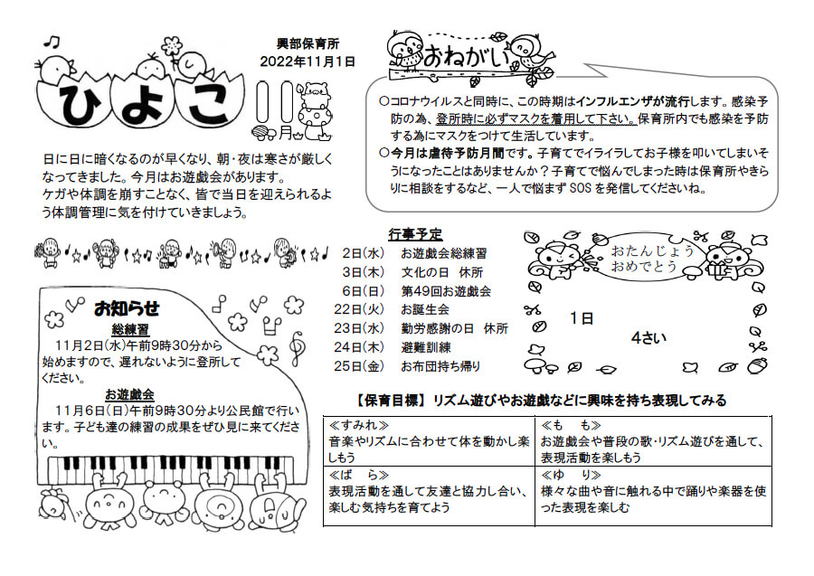 日に日に暗くなるのが早くなり、朝・夜は寒さが厳しくなってきました。今月はお遊戯会があります。ケガや体調を崩すことなく、皆で当日を迎えられるよう体調管理に気を付けていきましょう。