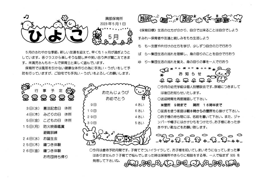 5月のさわやかな季節。新しい友達を迎えて、早くも1ヶ月が過ぎようとしています。各クラスから楽しそうな話し声や笑い合う声が聞こえてきます。未満児さんもホールで保育土と楽しく遊んでいます。