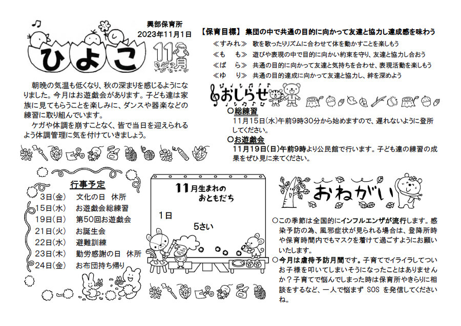 朝晩の気温も低くなり、秋の深まりを感じるようになりました。今月はお遊戯会があります。子ども達は家族に見てもらうことを楽しみに、ダンスや器楽などの練習に取り組んでいます。